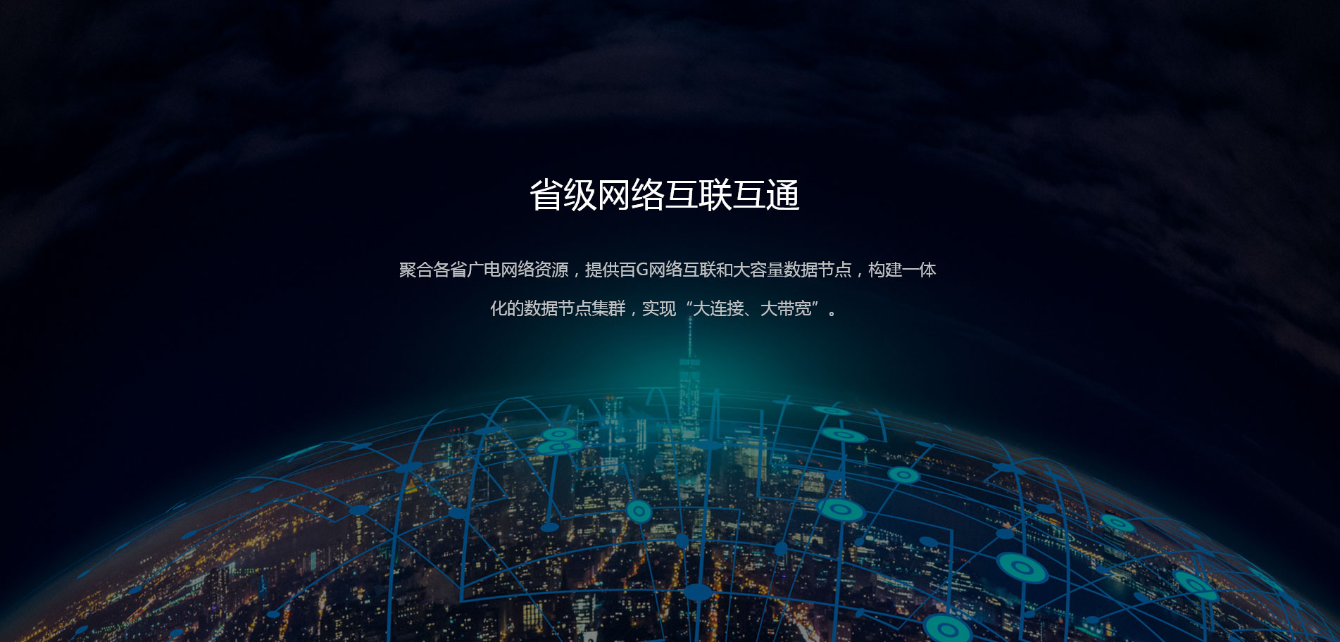 聚合各省廣電網絡資源,提供百G網絡互聯,構建全國性省際網絡互聯互通與數據節(jié)點等基礎服務;基于大連接與大數據融合的業(yè)務模式,提供廣電特色的數據技術服務。